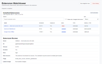 ส่วนขยายนี้ทำเครื่องหมายการเปลี่ยนแปลงที่มีความเสี่ยงสูงด้วยป้ายความเสี่ยงที่เรียบง่ายและมีอินเทอร์เฟซที่ใช้งานง่ายสำหรับการตรวจสอบการปรับเปลี่ยนล่าสุด ผู้ใช้สามารถตรวจสอบส่วนขยายแต่ละรายการเพื่อดูประวัติอย่างละเอียดและรับการแจ้งเตือนสำหรับเหตุการณ์ที่น่าสนใจ ด้วยการแนะนำและคำอธิบายในแอป Extension Watchtower ทำให้มั่นใจได้ว่าผู้ใช้เข้าใจความสามารถในการตรวจสอบของมัน ทำให้เป็นเครื่องมือที่มีค่า สำหรับใครก็ตามที่ต้องการควบคุมส่วนขยายของเบราว์เซอร์ของตนให้ดี